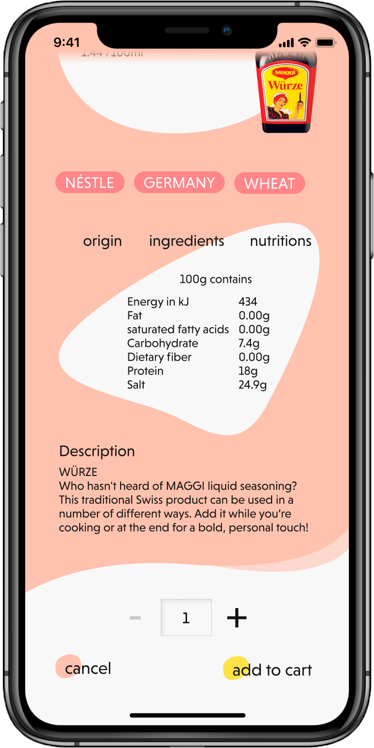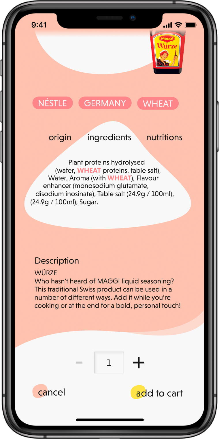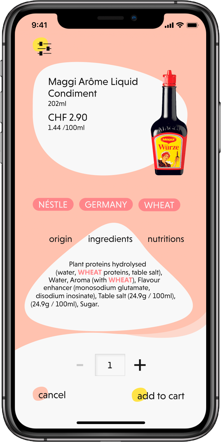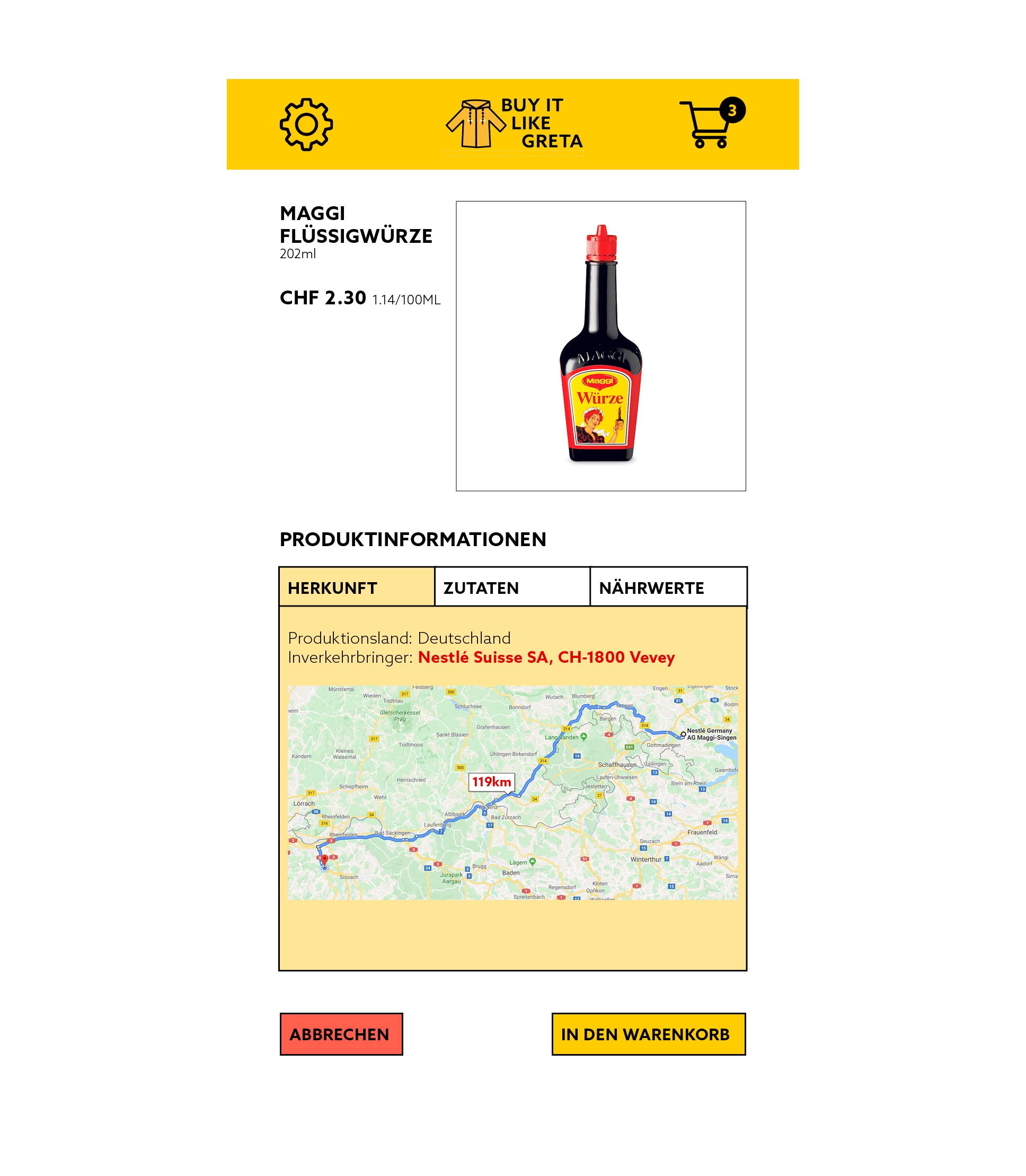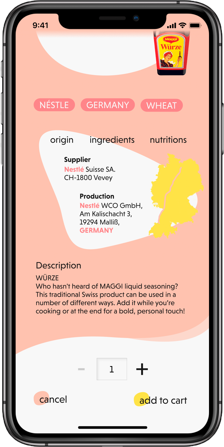 We provide a shopping aid through an app that highlights questionable ingredients and clearly displays the product’s transport route and manufacturer.